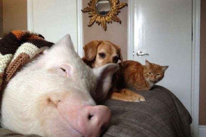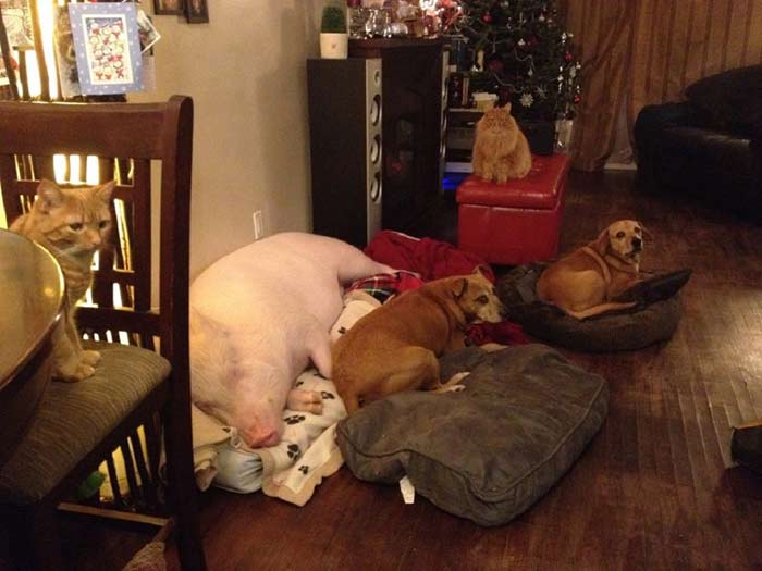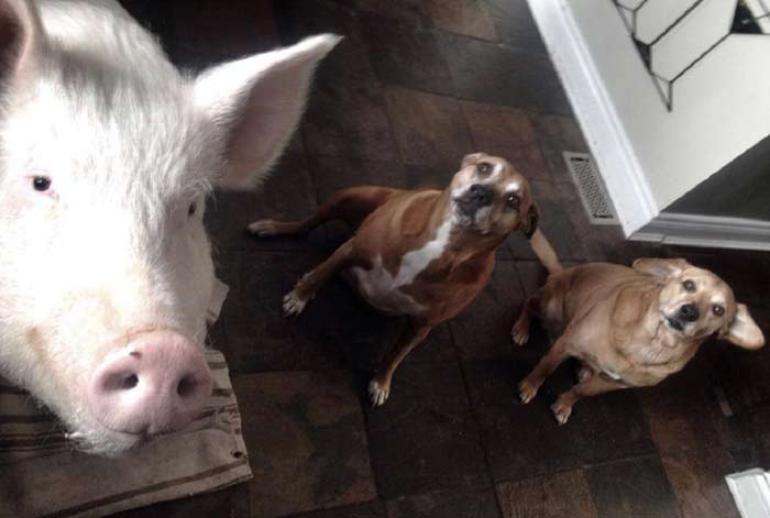 Qualche tempo fa, due ragazzi canadesi, Derek e Steve, hanno deciso di allargare la loro famiglia (già composta da due cani e due gatti) adottando Esther, una maialina che credevano essere nana: oggi pesa 175 chilogrammi ma fa ancora, ovviamente, a tutti gli effetti parte della famiglia ed è diventata una star del web. Loro, invece, sono diventati vegani.