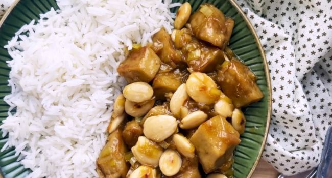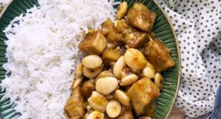 Deliziosi bocconcini di seitan saltati con mandorle e porri e insaporiti con aglio, zenzero, salsa di soia e aceto di riso, perfetti per una sera in cui avete voglia di un piatto etnico