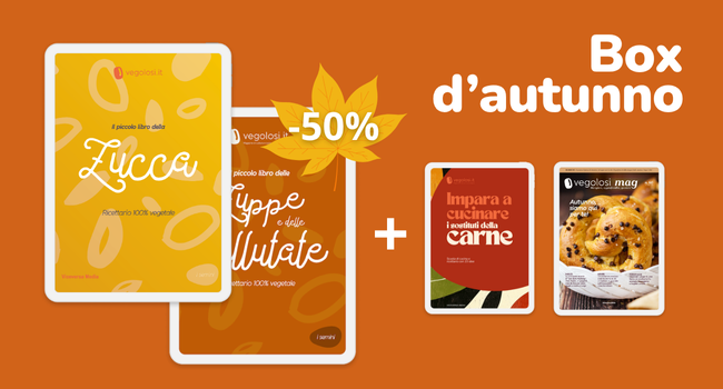 Queste sono solo alcune delle ricette che troverai nella box autunno 2025! E in più in regalo hai un numero della nostra rivista Vegolosi MAG!