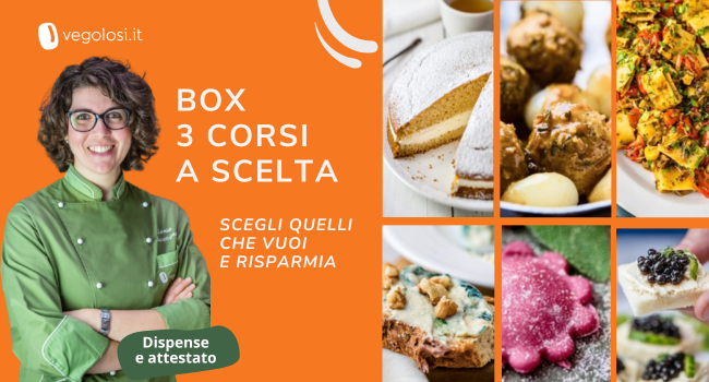 La Box 3 corsi che comprende 3 video corsi a scelta dalla Scuola di Cucina di Vegolosi.it costa 99 euro invece di 117 euro, con uno sconto del 15%.