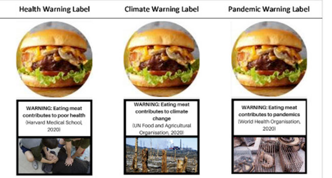 Ecco allora l’idea di apporre sulle confezioni di carne delle etichette che mostrano i rischi per il clima, la salute personale e la possibilità di nuove pandemie, con lo stile che abbiamo imparato a conoscere sui pacchetti di sigarette e sigari. Il test è stato realizzato su un campione di mille persone e ha dimostrato chiaramente come, senza significative differenze fra le diverse tipologie di etichette, la presenza degli avvisi porta ad un calo fra il 7.4% e il 10% dell’acquisto.