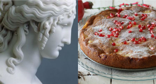 Una leggenda narra che al banchetto indetto da Zeus per il matrimonio di Peleo e Teti, Eris, la dea della discordia, gettò una mela d’oro con l’iscrizione “alla più bella”. Paride fu incaricato di scegliere chi fosse la  dea più bella tra Venere, Era e Atena. Il re di Troia scelse Venere, la quale gli promise che avrebbe potuto possedere la più bella tra tutte le creature mortali: Elena. Elena di Troia fu, così, barattata in cambio di una mela. In onore di questo mito vi proponiamo una torta di mela e melagrana.