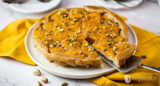 La tarte tatin è la famosissima torta francese “rovesciata”, in cui la farcitura di frutta viene disposta sul fondo della tortiera e la pasta frolla o pasta brisè viene adagiata sopra la frutta, ricoprendola interamente. In questa versione utilizziamo le nespole e per renderla più golosa la completiamo con granella di pistacchi
