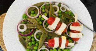Ode alle verdure estive in questa insalata di taccole e piselli con spiedini di tofu e pomodorini decisamente semplice da realizzare