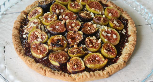Lavare i fichi e tagliarne una ventina a piccoli pezzi, mentre gli altri tagliarli solo a metà. In una casseruola unire il trito di fichi, un cucchiaio di zucchero, e cuocere lentamente per una decina di minuti a fuoco medio, mescolando di tanto in tanto. Stendere la marmellata di fichi sulla frolla, spolverizzare con granella di mandorle, adagiare sopra i restanti fichi tagliati a metà, ancora un pò di granella e un cucchiaio di zucchero di canna.