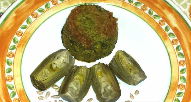 Trasferire il composto nei pirottini precedentemente oliati e passati nel pangrattato, riempiendoli a filo. Completate con una spolverata di pangrattato e un filo di olio. Infornate per 40 minuti a 200 gradi, sfornate e servite gli sformatini accompagnandoli con le verdure che più preferite. Io li ho abbinati a carciofi e semi di girasole.